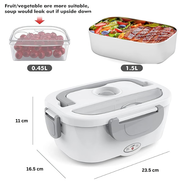 Questo contenitore riscaldato per il pranzo comprende due contenitori rimovibili da 1,5 litri e un contenitore di plastica da 0,45 litri che possono essere utilizzati in modo intercambiabile.
